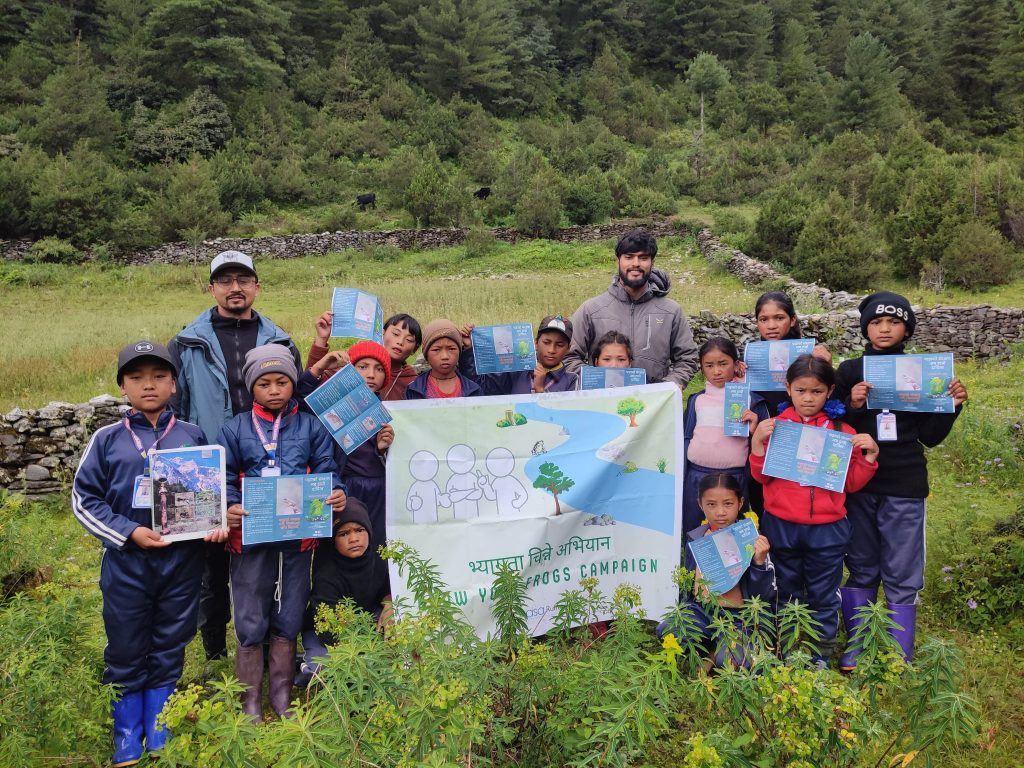Sapkota was determined to overcome the gap in sharing science with community. He then conducted around 15 frog classrooms in various schools around DHR and ACA. To popularize frogs and improve species identification skills of local communities, he initiated ‘Know your Frog Campaign’, in which locals, students, and policymakers participate in guided visits to frog’s habitat to understand on ecology and identification cues.